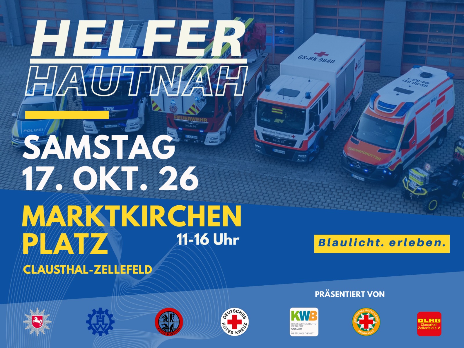Am 17. Oktober 2026 verwandelt sich der Marktkirchenplatz in Clausthal-Zellerfeld in einen Treffpunkt für alle, die sich für die Arbeit unserer Blaulichtorganisationen interessieren. Bei der Blaulichtmeile präsentieren die örtlichen Behörden und Organisationen mit Sicherheitsaufgaben (BOS) ihre vielfältigen Aufgaben und geben spannende Einblicke in ihren Alltag.
