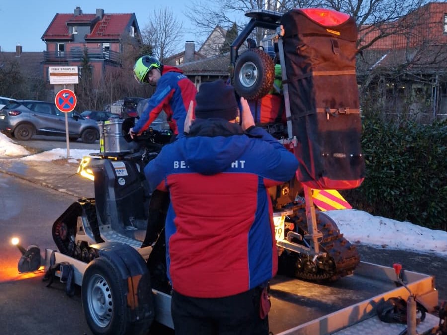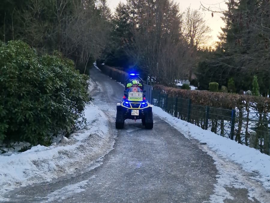 In der Nähe des Kranicher Teiches war eine Person beim Wandern gestützt und hatte sich dabei Verletzt. Während die Besatzung des Rettungswagens über den vereisten Weg fußläufig zum Unfallort gelangte, rückten die Einsatzkräfte der Bergwacht mit dem ATV an. Am Einsatzort eingetroffen, erfolgte die weitere medizinische Versorgung Hand in Hand. Nach Abschluss der Maßnahmen wurde die verletzte Person auf die UT2000-Trage umgelagert und mit dem ATV über den zum Teil stark vereisten Weg zum Rettungswagen transportiert.